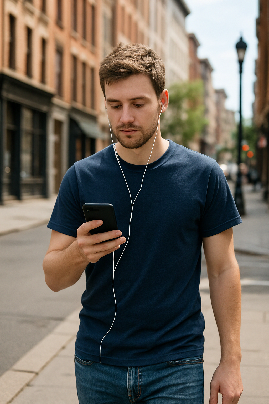 • 提示词:生成图片:白天街道上行走的一个普通人,拿着手机