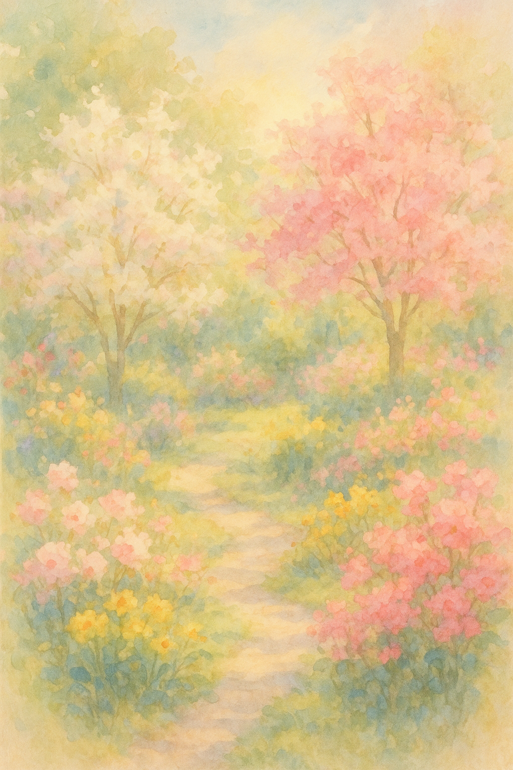 提示词:柔和的水彩画,描绘春天里繁花盛开的花园,光线温暖,色彩淡雅。