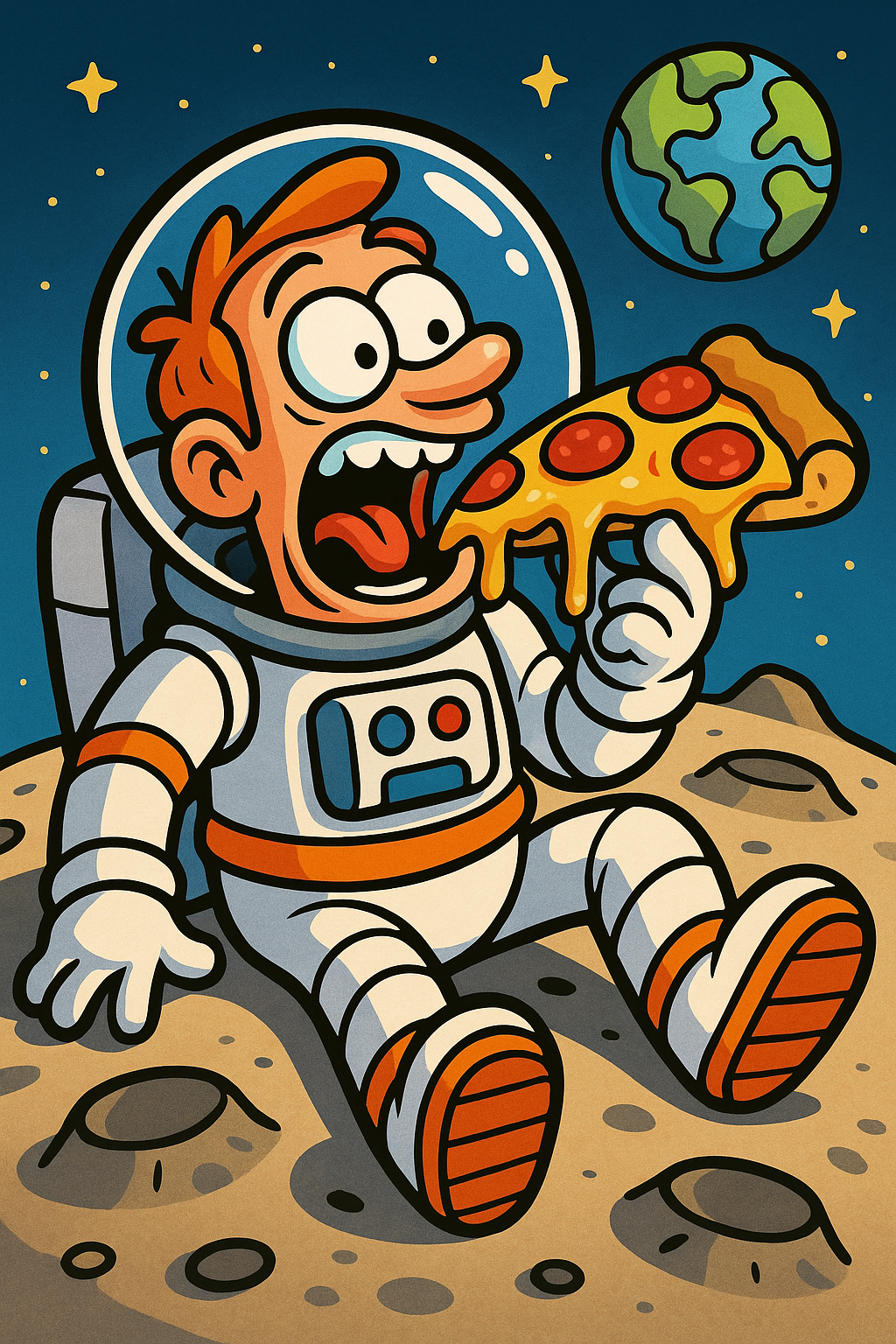 提示词:美式卡通风格,一个滑稽的宇航员在月球上吃披萨,表情夸张,色彩明亮。