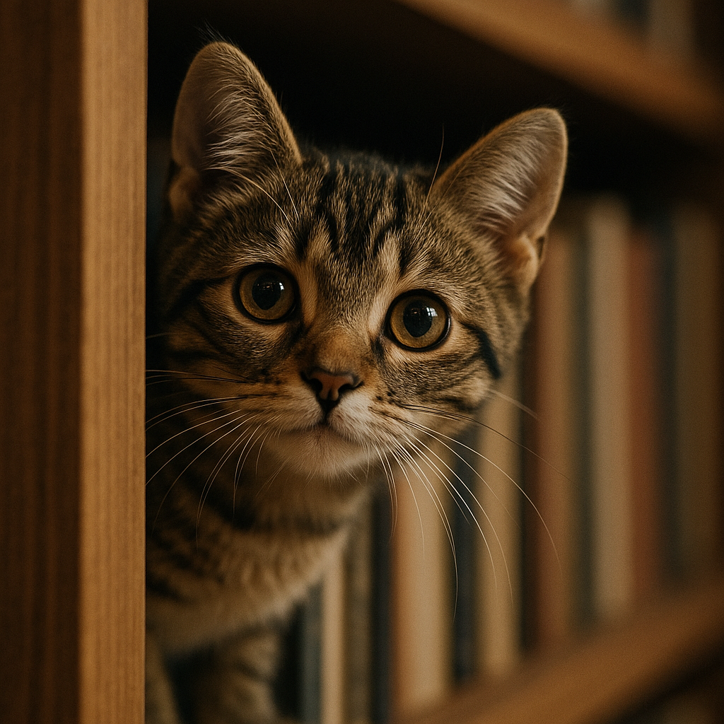 提示词:超写实照片风格,一只好奇的小猫从书架后面探出头,眼神明亮,毛发细节清晰可见,景深效果。