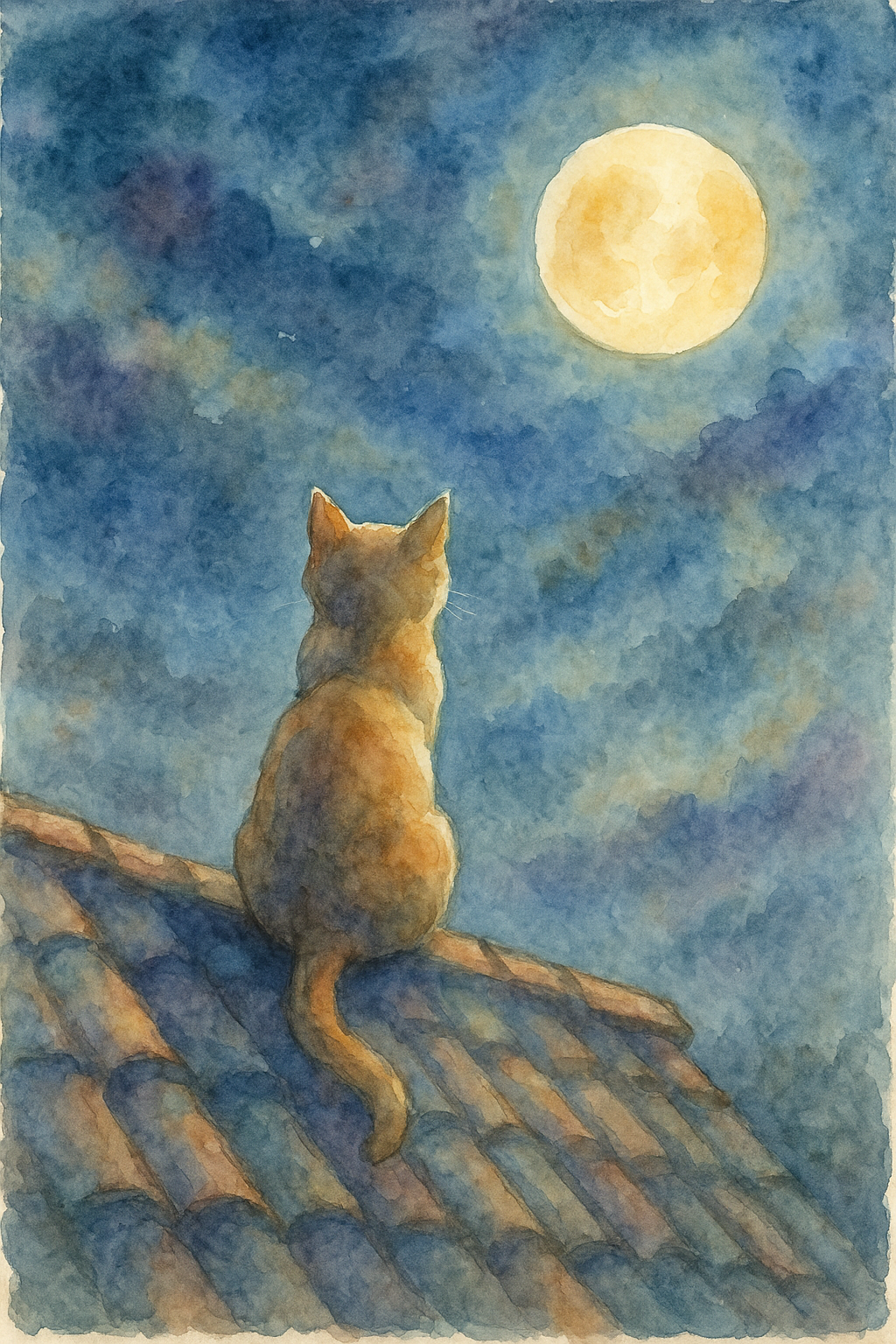 • 提示词:一只猫坐在屋顶上看月亮,水彩画风格,色彩柔和,湿画法。